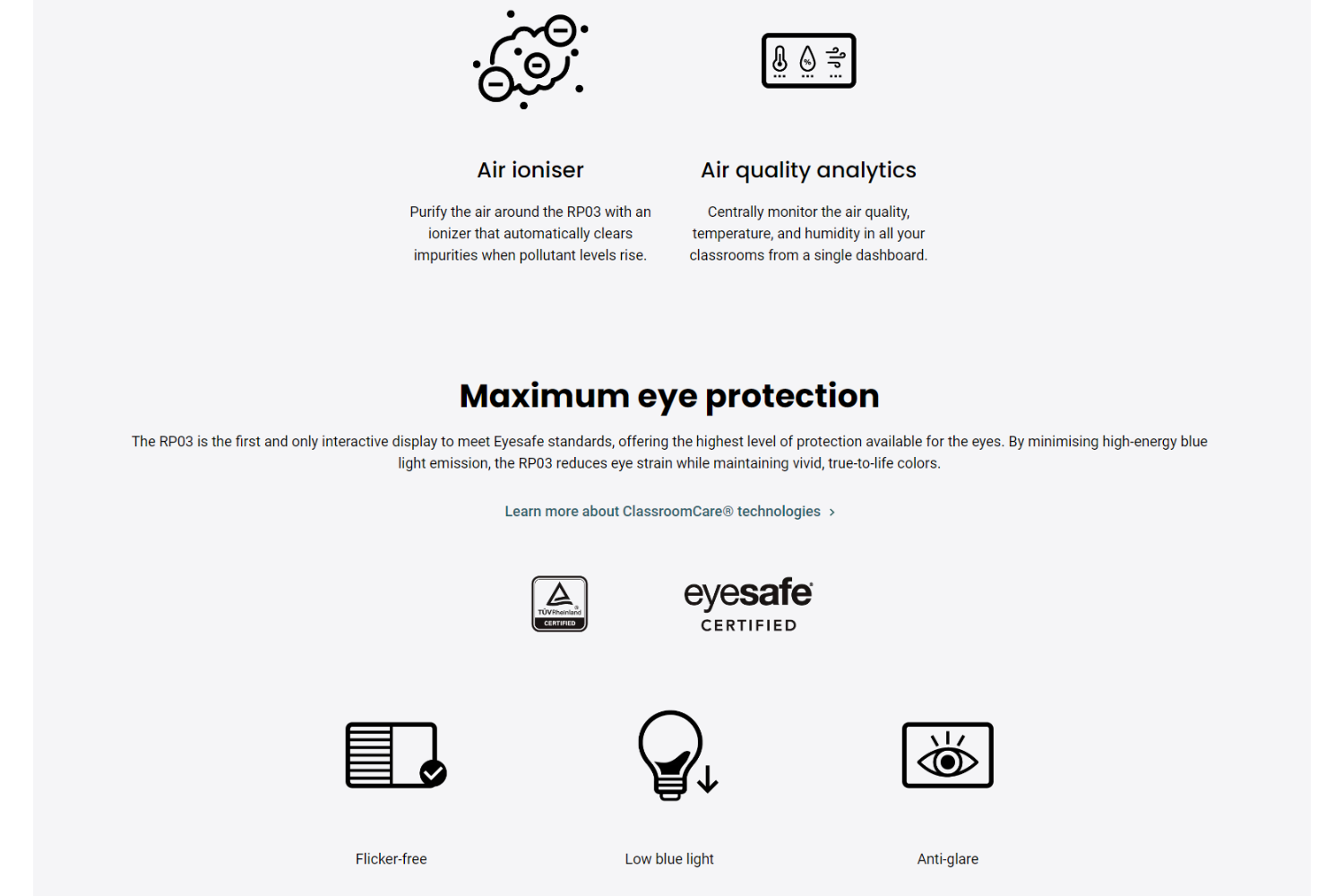 Poor indoor air quality negatively affects student health and performance. Our exclusive built-in air quality sensors allow you to monitor CO₂ and PM₂.₅ , and formaldehyde levels in the classroom so you can regulate air flow accordingly.