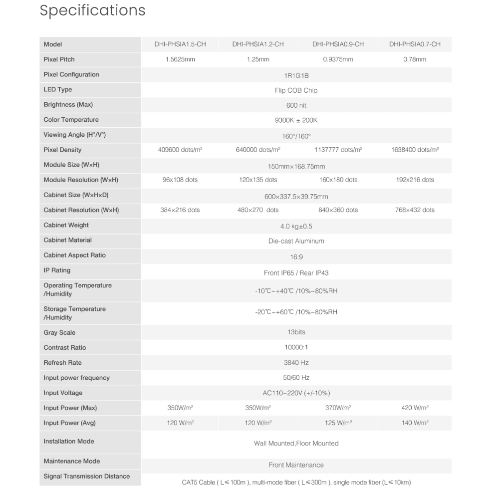 This model supports scalable resolutions in a 16:9 cabinet ratio, making it easy to build video walls from Full HD to 4K, 8K or even larger. Designed for reliability, precision and visual impact, the DHI-PHSIA1.2-CH delivers professional-grade performance in any indoor LED application.