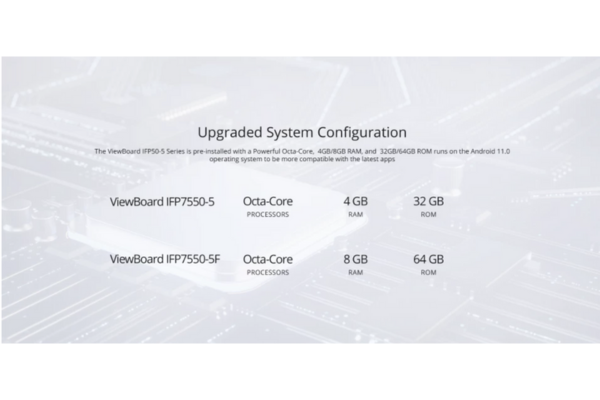 Enjoy powerful performance delivered by the ViewBoard 50-5 Series’ octa-core CPU, while ensuring all your data is safely protected with the Android 11 OS. This latest version is also compatible with more third-party apps, so you can access all your favorite services within a familiar environment.