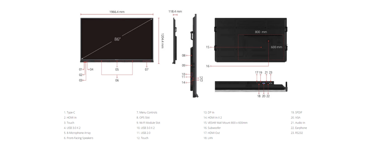 PACKAGE CONTENTS1. Power cable (3 meters) 2. Remote control 3. USB Type-C cable (1.5 meters) 4. USB Touch cable (3 meters, USB2.0) 5. Touch pen x 2 6. Quick Start Guide + Compliance statement 7. RS232 adapter 8. Clamp x 5 9. Camera Plate 10. Screw x 8 (camera 2+2, wall mount 4) 11. HDMI cable (3 meters) 12. Eraser 13. AAA Battery x 2